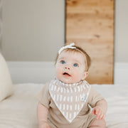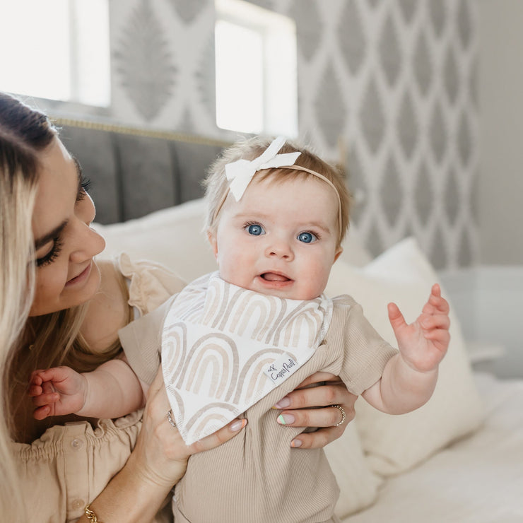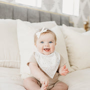 These stylish drool bibs are made of 100% absorbent cotton on the front and 100% polyester fleece on the back. The front of the baby bib is a stylish knit fabric and the back is a super soft fleece that keeps your baby completely dry even with the drooliest of babies. Great for teething babies!