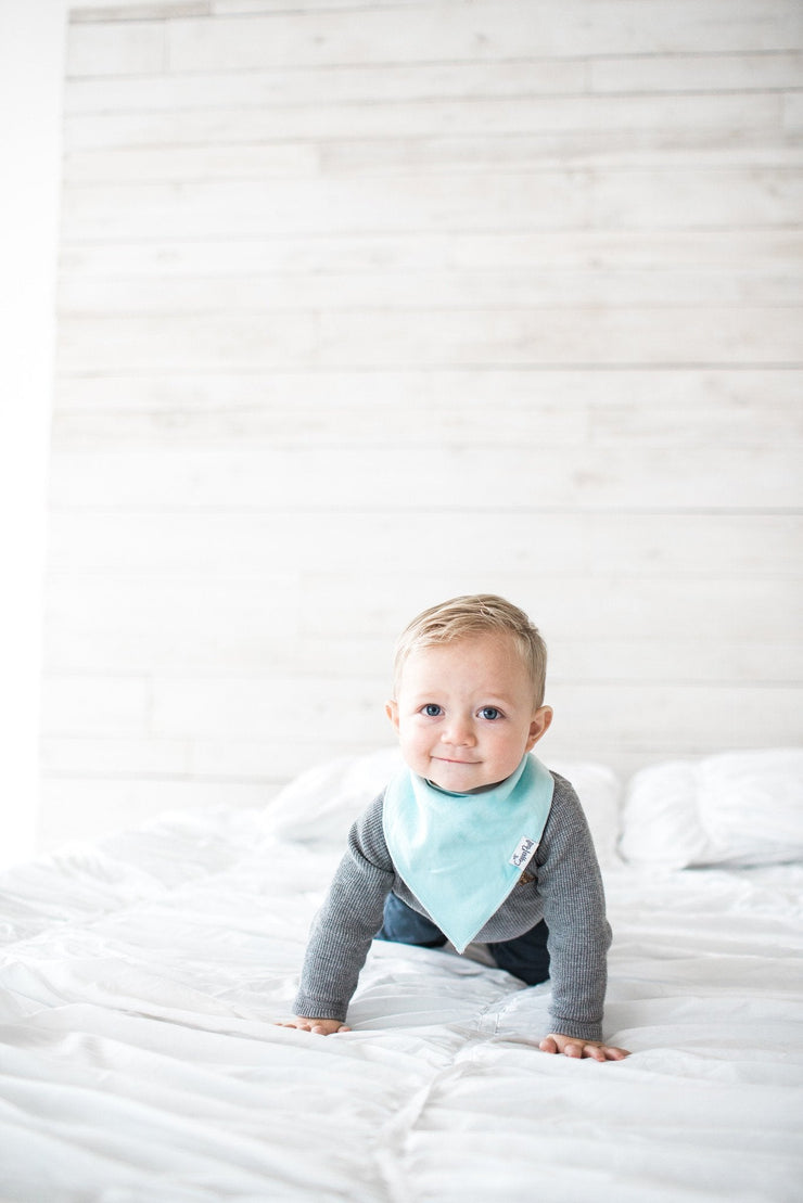 These stylish drool bibs are made of 100% absorbent cotton on the front and 100% polyester fleece on the back. The front of the baby bib is a stylish knit fabric and the back is a super soft fleece that keeps your baby completely dry even with the drooliest of babies. Great for teething babies!