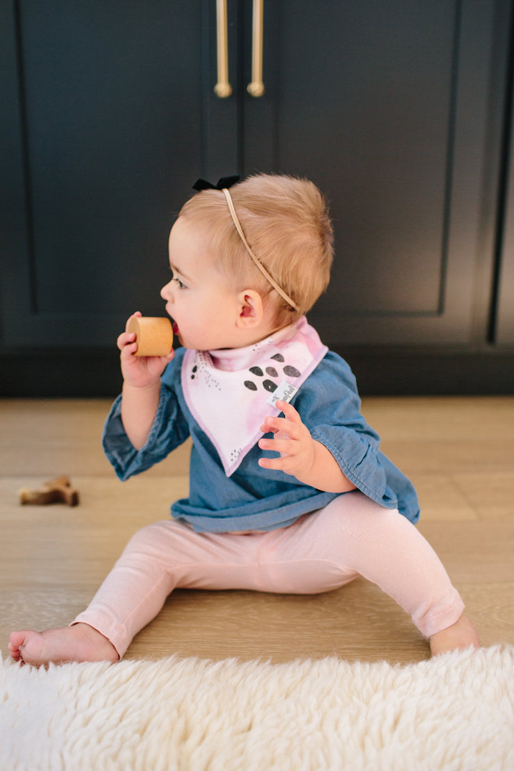 These stylish drool bibs are made of 100% absorbent cotton on the front and 100% polyester fleece on the back. The front of the baby bib is a stylish knit fabric and the back is a super soft fleece that keeps your baby completely dry even with the drooliest of babies. Great for teething babies!