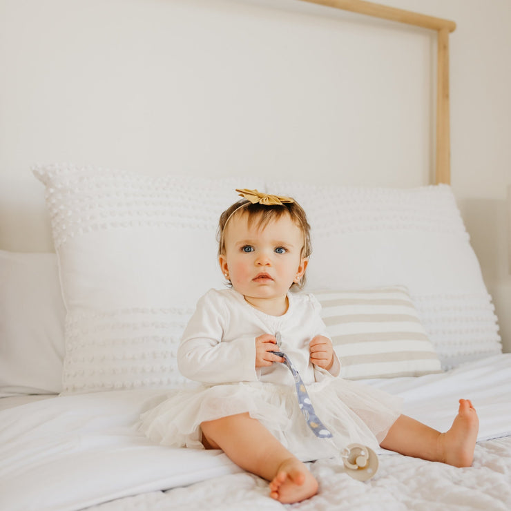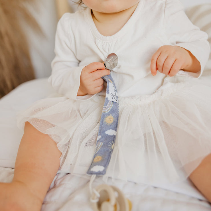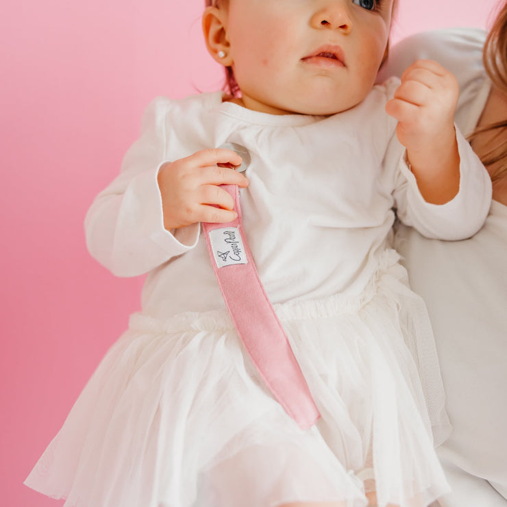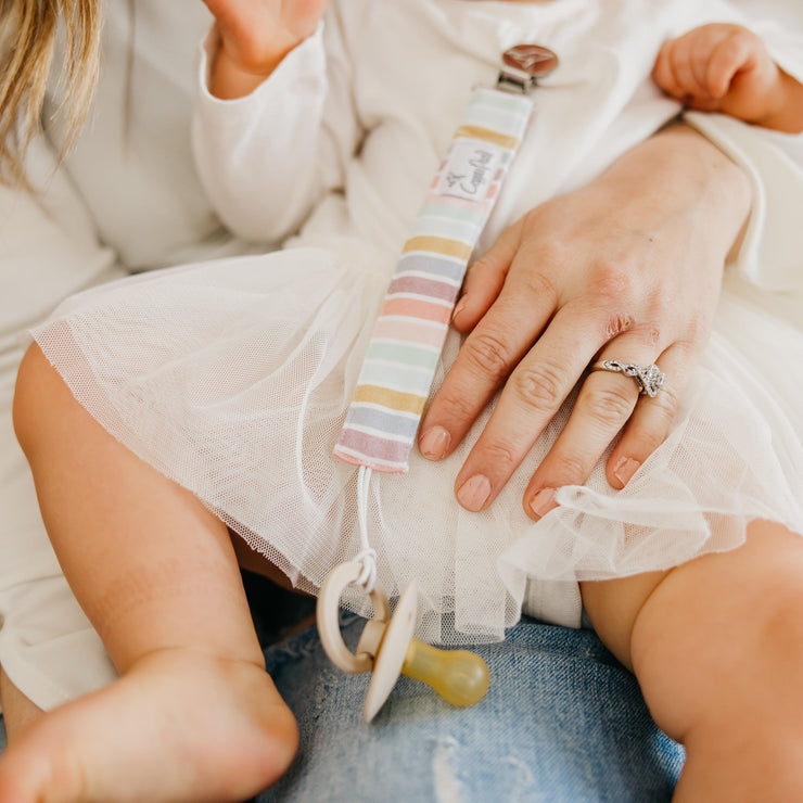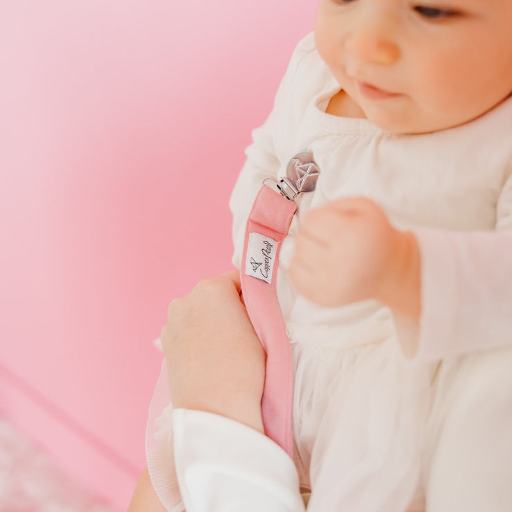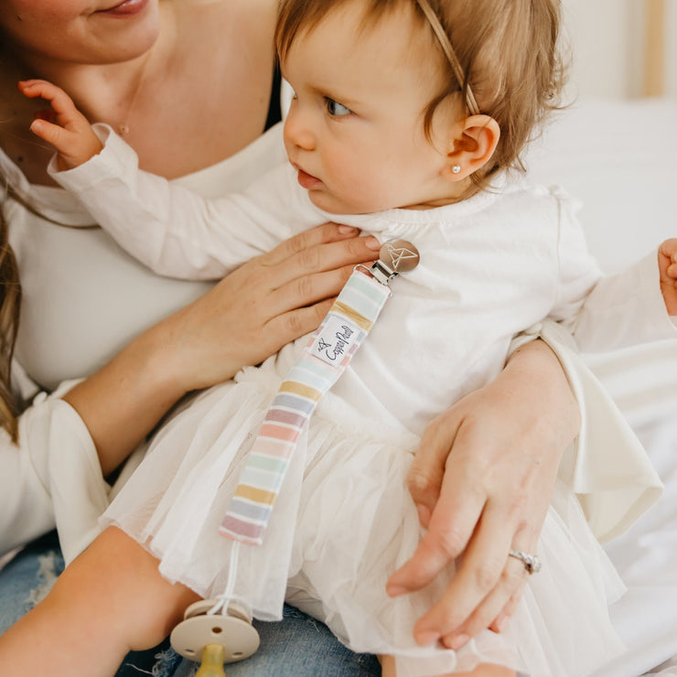 Offering the ultimate blend of fashion and function, our unique Binky Clip features a premium knit strap lined with absorbent fleece to help soak up drool. Simply attach baby's pacifier or teether to one end, then fasten the clip to clothing, blankets or baby gear. Oh, and by the way our set includes three Binky Clips to keep with you wherever you go - no more floor drops or pacifier pick-ups!