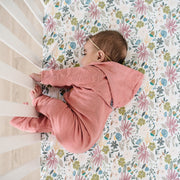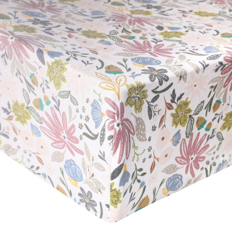 Copper Pearl's crib sheets are made from 100% woven cotton which feels very soft to the touch and holds up well over many uses. Both lightweight and breathable, the cotton promotes a cool and comfortable night’s sleep.  Wash before use to ensure the best fit and softness for baby.