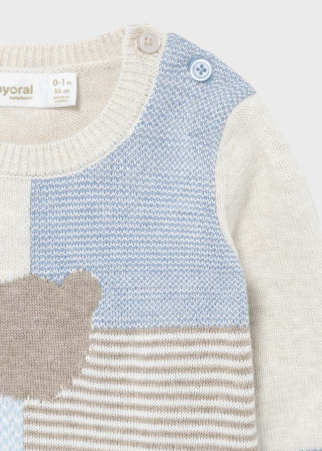 Long sleeved Jumper for Newborn boy 0 to 4/6 months. Round neckline. Buttons fastenings on the shoulder.