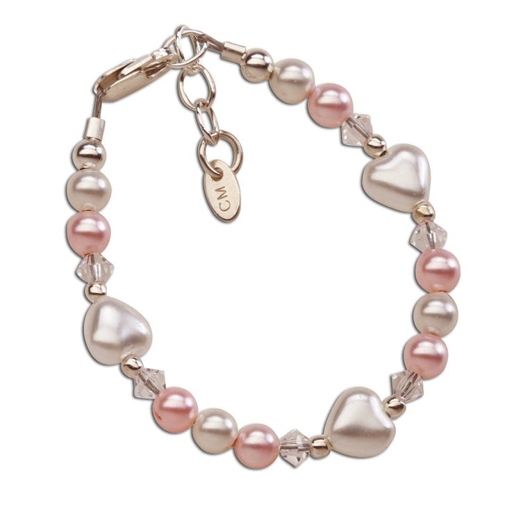 This sweet sterling silver bracelet features pink and white Swarovski pearls accented with beautiful Czech pearl hearts -perfect for your little sweetheart! This is a timeless keepsake that makes a perfect baby gift, Valentines present, or just a special keepsake for the little girl you love! This bracelet comes in a beautiful gift box that kids love.